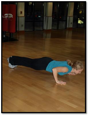 - Straighten arms, keeping abs tight and lift up on your toes (or knees for a modified version)so your body is flat like a table…get that butt out of the air!